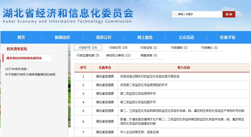 2、推进行政审批事项公开。依托省审改办开发的“台湾a片 网上办事大厅”和“台湾a片 网上行政审批通用系统”及“湖北政务服务网”,行政审批业务实现了“外网申请、内网办理”。企业只需在互联网上申请,上传资料,后期受理、审查、审批、办结由内网完成,最大限度实现了便民服务,保证权力在阳光下运行。今年,我委对于取消、调整的行政审批事项进行了及时调整并对外公布。一是根据《国务院关于第三批取消中央指定地方实施行政许可事项的决定》(国发﹝2017﹞7号)要求,取消“生产无线电发射设备型号核准初审”、“食盐准运许可”、“食盐中添加营养强化剂或药物许可”3项职权事项。二是根据目前融资性担保机构的发展现状及实际工作要求,将“融资性担保机构的设立与变更审批”中“变更审批”权限下放到市(州)人民政府确定的部门,省经信委只保留“省属企业、中央驻鄂企业设立的融资性担保机构的变更审批。三是根据省审改办的统一部署,进一步梳理我委行政许可事项,取消“铬化合物生产建设项目审批”、“盐斤通行证核发”等许可事项,同时一并报请取消“限制类产业政策证明”、“农药生产核准的初审”等职权事项。